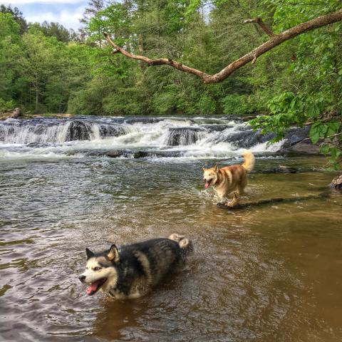 Dog friendly hike near Dawsonville, Georgia that features a waterfall and does get its fair share of traffic. The trail is shred by hikers, trail runners, and large groups year-round.