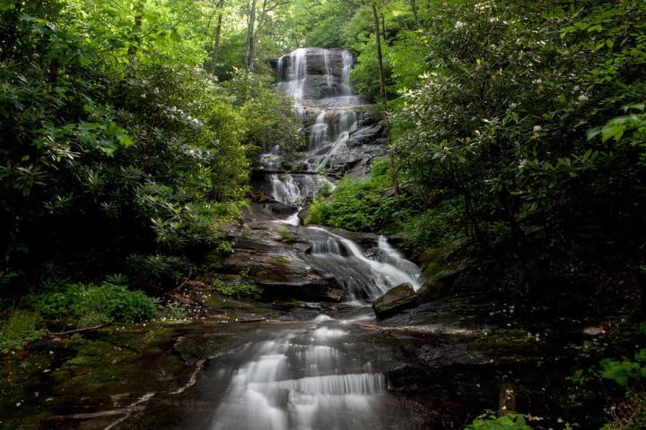 This trail is not well signed but it is easy to find. It follows an old forest service road along Nimblewill Creek. At the fork with Bearden Creek the trail branches to the right and narrows as it climbs steeply to the falls.