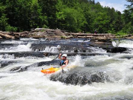 The Lower Amicalola is a serious whitewater stream, with Class II-IV+ rapids and enough volume to challenge the most experienced whitewater enthusiast. Starting at the launch just north of the Highway 53 bridge, the lower Amicalola immediately picks up steam, with a series of small ledges, holes and drops in the few hundred yards leading up to the first major rapid in the lower river – Edge of the World. This rapid is a series of drops and slots with several major cataracts. The entire rapid can be easily scouted, and prudent boaters should take heed because this section has the potential for real problems should a boater end up in the water. From this point, the river’s character is wild adventure, with major rapids like Off-the-Wall, Split Rock, and Roostertail, interspersed with plenty of Class II water, providing back-to-back action for the next 9 miles.